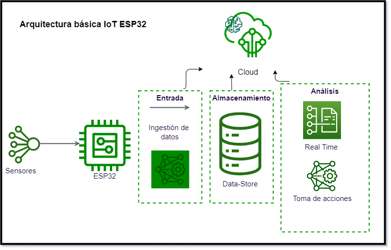 3) ¿Que hacemos, después de tomar datos y almacenarlos? Los procesos después de registrar datos y almacenarlos pueden ser múltiples y variados, tales como realizar análisis, tomar decisiones en tiempo real, o utilizarlos para generar acciones, y todo esto puede ser configurado y programado en el microcontrolador ESP32. (Un Acción puede ser algo como: Apagar una luz de una alcoba, apagar una Bomba, apagar un motor).